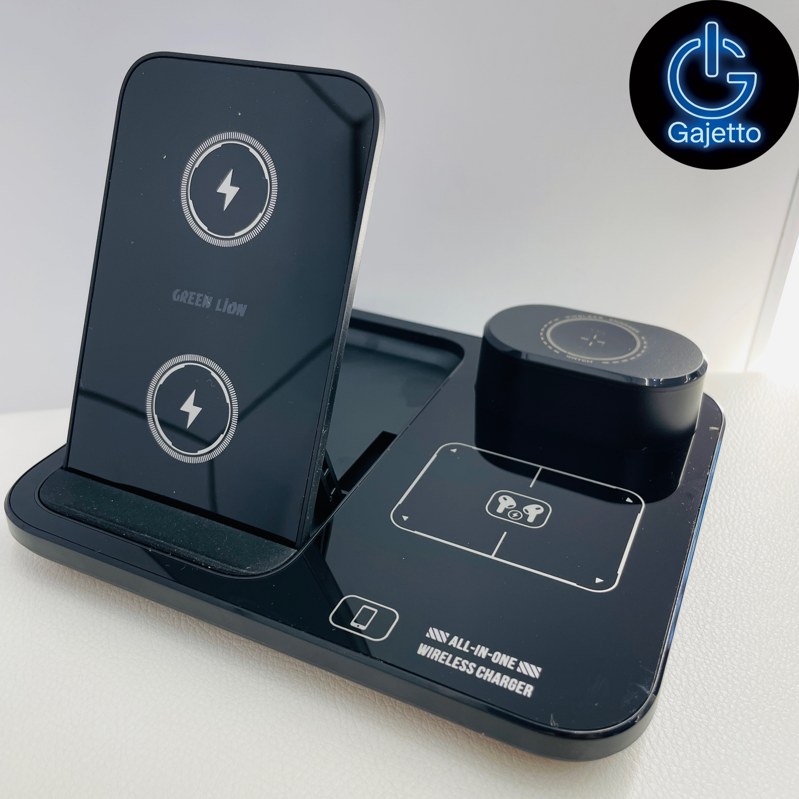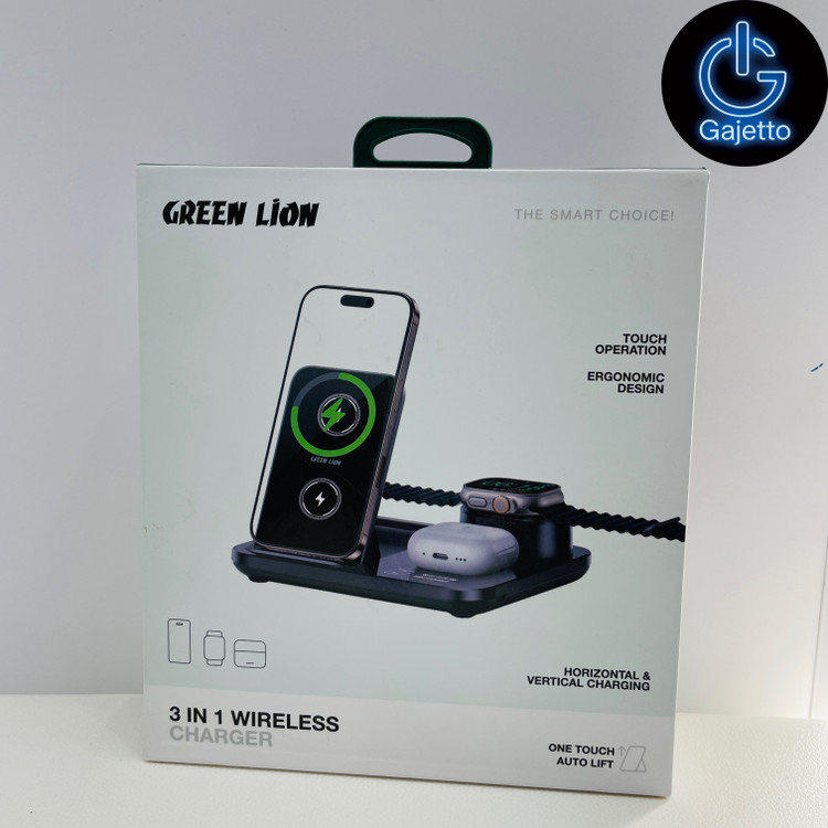 شارژری هوشمند، همهکاره و کامپکت که امکان شارژ همزمان گوشی، هدفون بیسیم و ساعت هوشمند را در یک پایه فراهم میکند. مدل Power Trio 3-in-1 از برند Green Lion با توان خروجی تا ۱۵ وات (برای گوشی) و طراحی تاشو و سبک برای استفاده در خانه، دفتر، کنار تخت یا سفر.